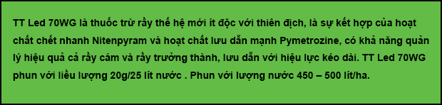 Theo kết quả thực hiện trên các tỉnh Đồng bằng Sông Cửu Long, trong điều kiện ruộng bị rầy nâu gây hại có rầy cám nở khoảng 90%, sau khi phun TT Led 70WG từ 15 phút đến 1 giờ rầy bắt đầu rớt nước và “đóng cục”. Hiệu lực trừ rầy sau 1 giờ khoảng 80% và sau 48 giờ khoảng 95%.