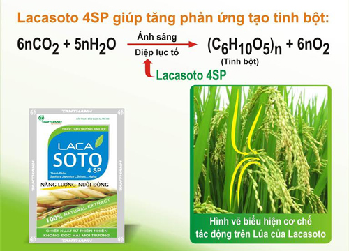 - Phase flowering to ripening rice, the rice here is phase transport nutrients from the leaves to the grain, this stage should not spreading but to help increase energy transport rate of leaf starch in grain finish promote the formation of starch in rice maximum due to the increase in reserves and maintains the index in three leaf chlorophyll capabilities, product Lacasoto "granulating Energy" will contribute to increased productivity rice.