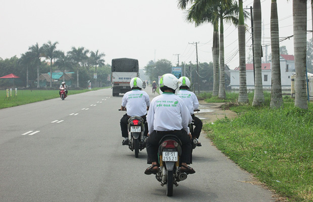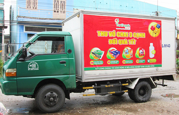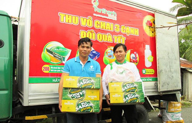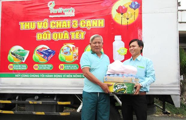 In early morning, trucks decorated with “Collect empty bottle- Get Tet gift” banners were heading to bottle gathering sites. Many farmers were eager to carry their bottles to come there at early time. The farmers could make decisions to exchange gifts based on their numbers of empty bottles.