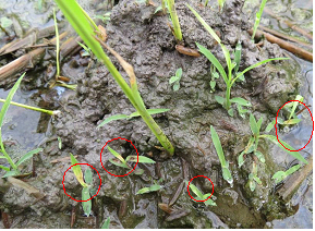 Hiệu quả kiểm soát cỏ sau 4 ngày phun: cỏ lồng vực (cỏ gạo) và đuôi phụng đã có biểu hiện ngộ độc thuốc và bên trong cây cỏ đang phân hủy.