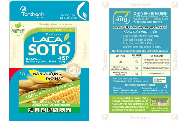Lacasoto 4SP is a biopesticide used especially in flowering stage of rice. It helps create and increase grains rapidly, lengthen the leaf lifespan, enhance productivities, reduce pests, make the plants flower simultaneously and 3-5 days sooner than usual.