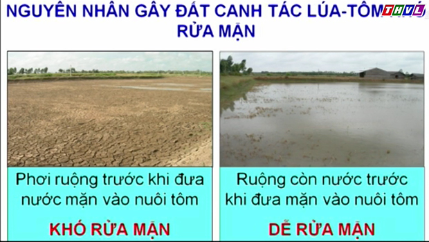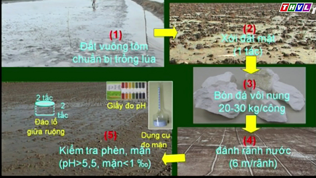 GS.TS Nguyễn Bảo Vệ cũng tư vấn kỹ thuật về xử lý đất mặn: “Tiến hành xới đất, sau đó bón vôi để vôi đẩy mặn ra sau đó tạo các rãnh nước để đẩy nước mặn ra ngoài. Ngoài ra có thể kiểm tra bằng cách đào một cái hố nhỏ ở giữa đất để nước trong đất thoát ra và tiến hành đo độ pH, nếu pH>5.5 và pH<1 o/oo là chấp nhận được.”