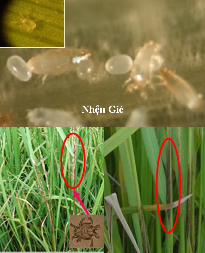 Vì vậy mà Bà con Nông dân rất khó phát hiện được sự tấn công cũng như khả năng nhân nhanh mật số gây hại của đối tượng dịch hại này trên đồng ruộng của mình. Vâng, đối tượng dịch hại mà tôi muốn nói đến đây chính là con Nhện Gié. Nhện Gié có vòng đời cực ngắn từ 10 - 13 ngày, kích thước cơ thể nhỏ từ 0,2 - 1mm, mật số sinh sản khá cao, một con cái có thể đẻ khoảng 50 trứng rải rác trong bẹ lá, trứng hình bầu dục, màu trắng. Nhện Gié rất thích hợp phát triển và nhân nhanh mật số trong điều kiện nắng nóng, khô hạn như trong vụ Hè Thu và gây hại nặng nề đến năng suất, đặc biệt là ở giai đoạn lúa trổ lẹt xẹt và trổ đều làm cho lúa không thể trổ thoát hoặc trổ nhưng bông vẫn bị hư hại.