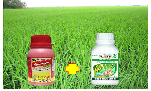 - Phun Plastimula 1SL tăng cường sức sống liều lượng 20 ml/bình 16 lít nước phối trộn với Supergen 5SC liều lượng 20 ml/bình 16 lít nước, phun 2 bình trên 1.000 m2. Phun thuốc 2 ngày thì bón phân đợt 2. Sau 5 ngày phun thuốc thì thấy lúa phát triển tốt trở lại, các đầu lá bung ra, lá xanh mướt, cây đẻ nhánh mạnh, bộ rễ phát triển hơn và ra nhiều rễ trắng.