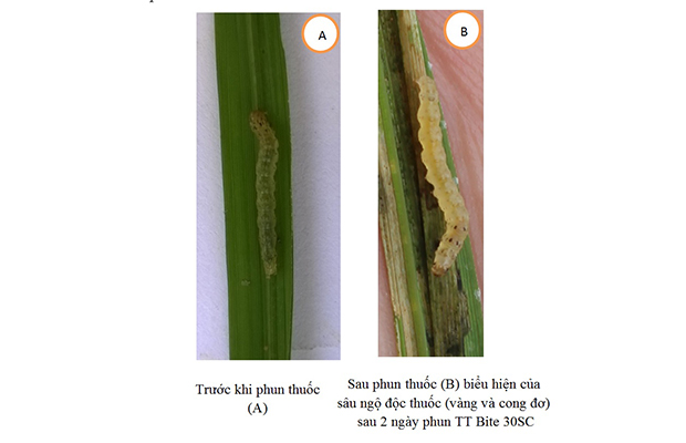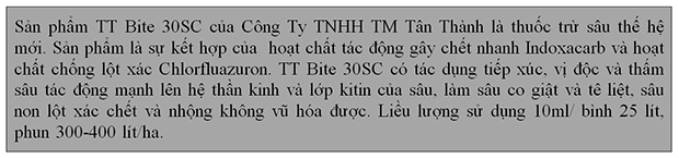 Qua nhiều kết quả khảo nghiệm của các trạm BVTV Bình Tân- Vĩnh Long, trạm BVTV Châu Phú-An Giang, trạm BVTV Long Mỹ-Hậu Giang cho thấy, Sản phẩm TT Bite 30SC là sản phẩm diệt trừ sâu cuốn lá đạt hiệu quả cao. Sâu non chết nhanh sau 2 ngày phun. Hiệu lực thuốc đạt 85-90% sau 3 ngày phun thuốc.