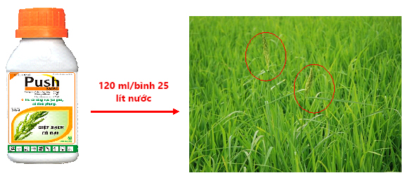 Vụ Hè Thu nắng nóng kéo dài làm cho nước bốc hơi nhiều, cộng với đất không bằng (chỗ gò, chỗ trũng) và không giữ được nước nên rất dễ bị sót cỏ sau khi đã diệt mầm. Bà con cần kiểm tra những chỗ gò để phát hiện cỏ sót sớm, nếu sót ít thì tiến hành nhổ, sót nhiều sử dụng thuốc trừ cỏ hậu nẩy mầm. Đối với những ruộng sót cỏ lồng vực và cỏ đuôi phụng, bà con nên sử dụng thuốc trừ cỏ Push 330EC theo liều khuyến cáo, nếu lỡ xảy ra trường hợp cỏ lớn và có bông như ruộng anh Trung, bà con có thể tăng liều Push gấp 5 lần khuyến cáo để tiêu diệt cỏ mà vẫn an toàn cho lúa.