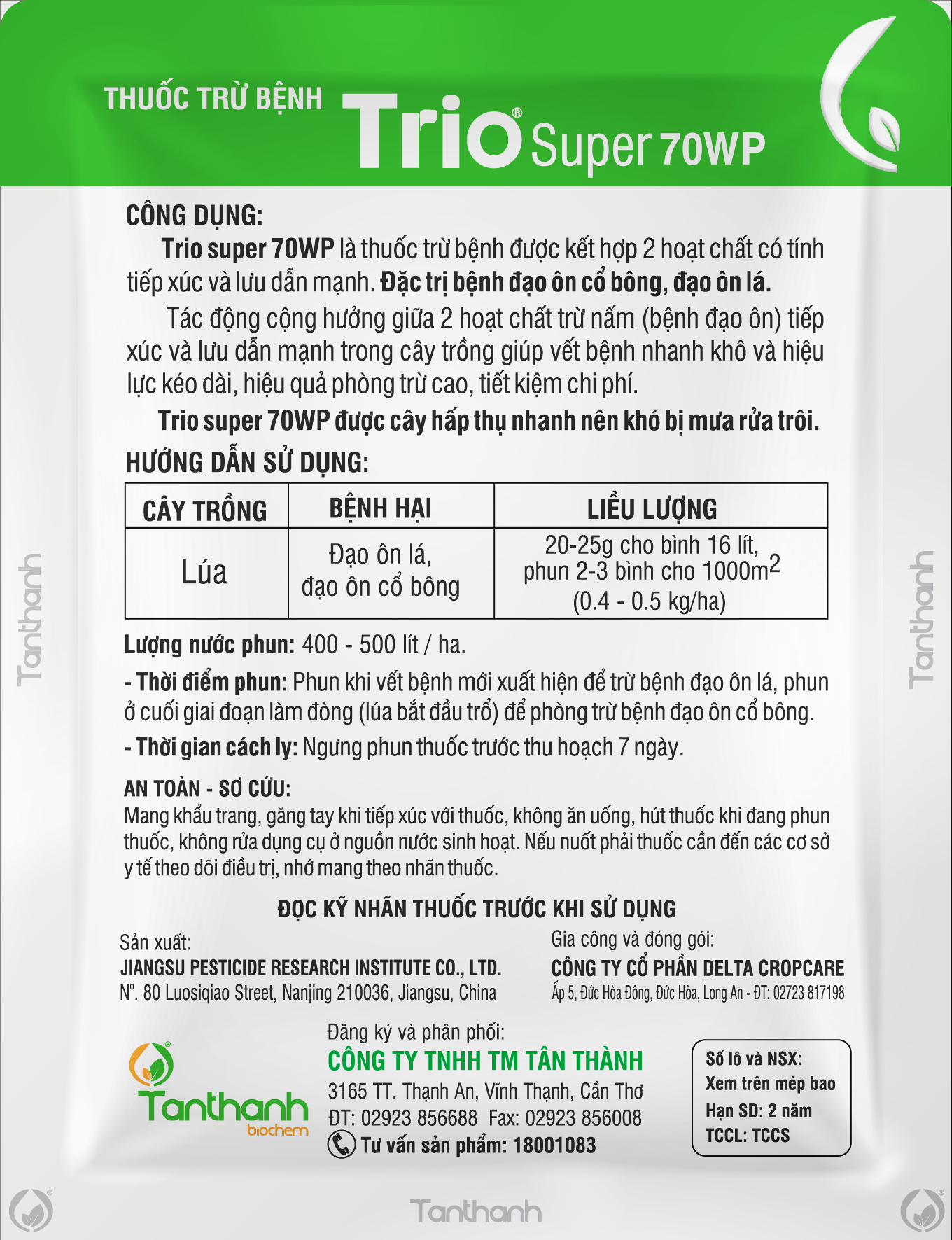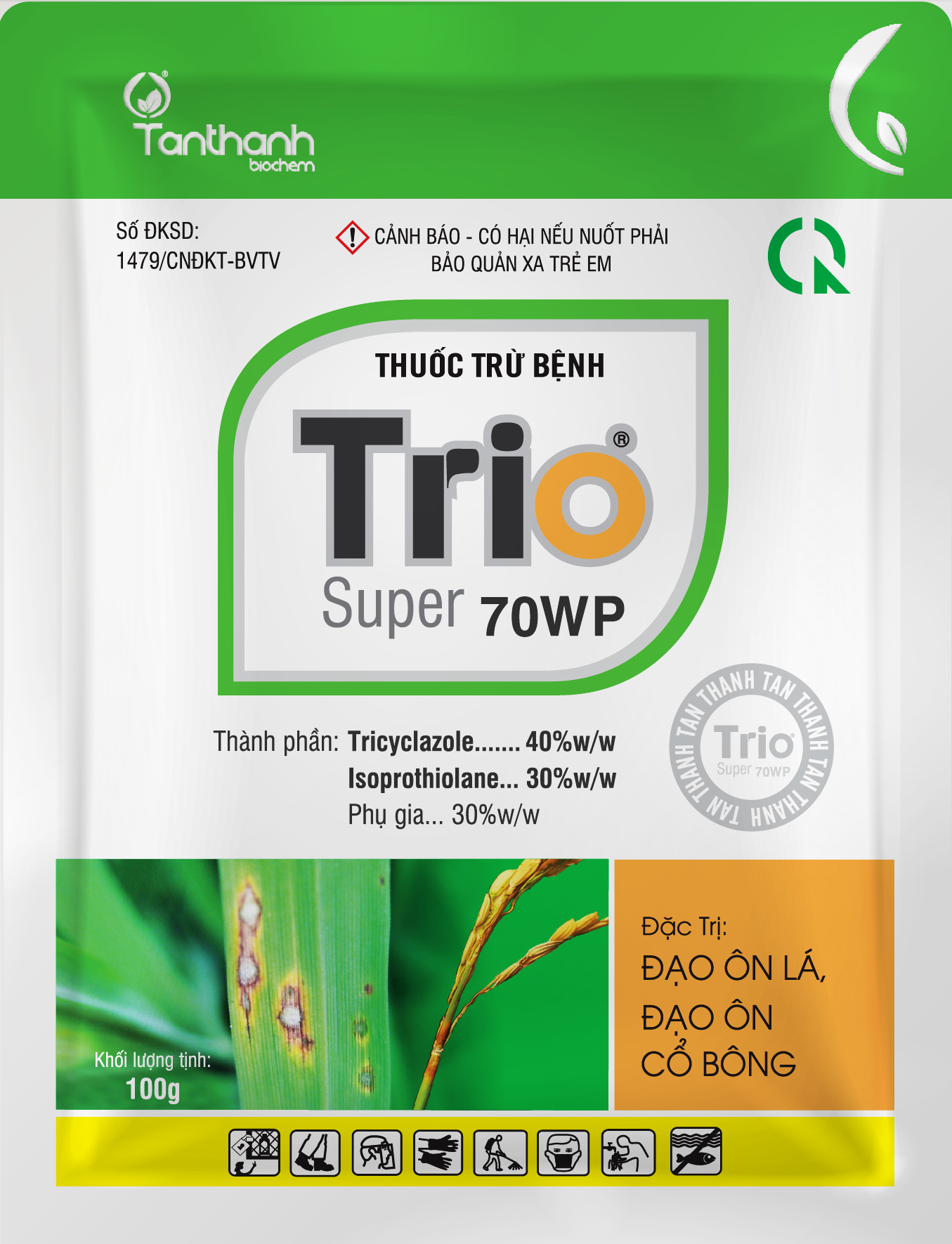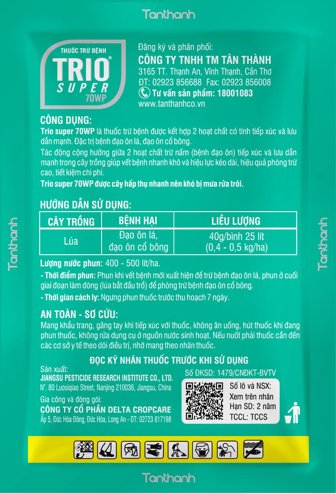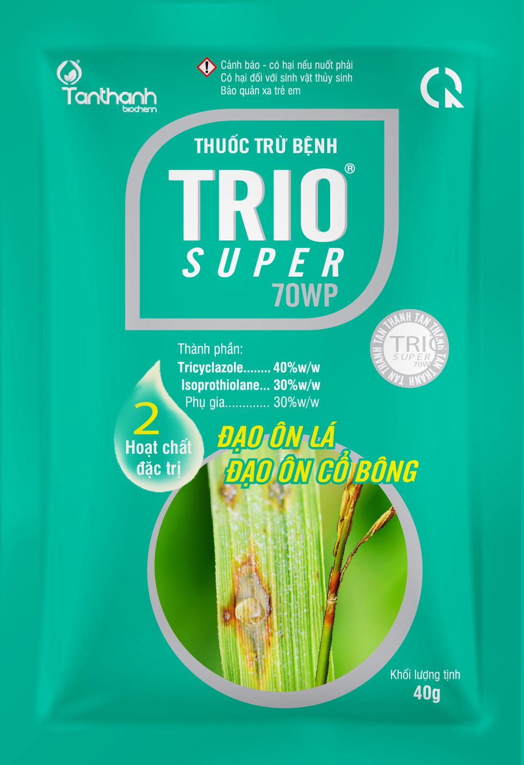 - Trio super 70WP là thuốc trừ bệnh chứa hai hoạt chất có tính tiếp xúc và lưu dẫn. Đặc trị bệnh đạo ôn lá , đạo ôn cổ bông